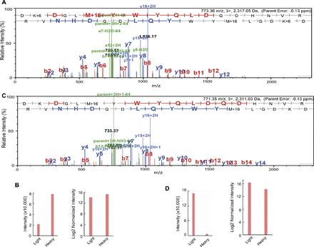 Mass spectrometry quantification of a RSF1 unique peptide in H2Aub-enriched and -depleted nucleosomes. (A) Spectrum of a RSF1 fragment (DKDGLmYWYQLDQDHNVR) in H2Aub-enriched and -depleted nucleosomes. In these experiments, H2Aub-enriched nucleosomes were labeled with heavy lysine and H2Aub-depleted nucleosomes were obtained from cells cultured in light medium. (B) Quantification of the labeled RSF1 fragment intensity from A. Both the intensity and log2-normalized intensity are shown. (C) Spectrum for RSF1 Fragment (DK+6DGLmYWYQLDQDHNVR) in H2Aub-enriched and -depleted nucleosomes. In these experiments, H2Aub-depleted nucleosomes were labeled with heavy lysine and H2Aub-enriched nucleosomes were obtained from cells cultured in light medium. (D) Quantification of the labeled RSF1 fragment intensity from C. Both the intensity and log2-normalized intensity are shown.
