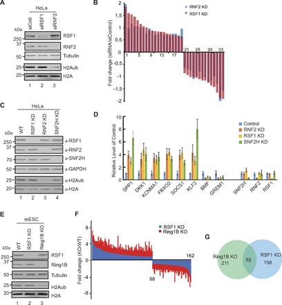 Significant correspondence between RSF1 and RNF2/Ring1B regulated genes. (A) Immunoblot analyses of HeLa cells with KD of RSF1 or RNF2 confirmed the reduction of corresponding target proteins. Antibodies used are indicated on the right of the panels. (B) Waterfall plot showing gene expression changes in RNF2 KD and RSF1 KD HeLa cells. The majority of these genes show changes in the same direction. (C) Immunoblot analyses of control, RSF1, RNF2, and SNF2H KD HeLa cells confirmed the reduction of corresponding target proteins. Antibodies used are indicated on the right of the panels. (D) RT-qPCR analysis of the expression of representative genes in control HeLa cells and in HeLa cells with KD of RSF1, RNF2, and SNF2H. (E) Immunoblots of wild-type, RSF1 KO, or Ring1B KO mouse ESCs confirmed the reduction of corresponding target proteins. Antibodies used are indicated on the right of the panels. (F) Waterfall plot showing gene expression changes in Ring1B KO and in RSF1 KO mouse ESCs. The majority of these genes show changes in the same direction. (G) Venn diagram shows the overlap of H2Aub bound genes with significant changes in expression in Ring1B or RSF1 KO mouse ESCs.