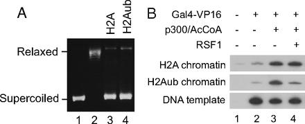 RSF1 represses transcription activation from H2Aub nucleosome-containing chromatin in vitro. (A) Supercoiling assay of reconstituted chromatin template. The purified supercoiled plasmids (lane 1) were relaxed to closed circular templates using topoisomerase I (lane 2). After protease digestion and phenol-chloroform extraction, the relaxed plasmids (lane 2) were mixed with histone/ACF/Nap1 in the presence of topoisomerase I to reconstitute chromatin template that restore DNA supercoiling. DNA was then purified and changes in linking number were demonstrated (lanes 3 and 4). (B) In vitro transcription assay on naked DNA and on chromatin templates reconstituted with H2A or semisynthetic H2Aub. GAL4-VP16 and p300/AcCoA activate transcription. RSF1 inhibits transcription activation on H2Aub chromatin template, but has no effect on transcription activation on H2A chromatin.