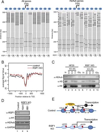 RSF1 is required for maintaining the pattern and stability of H2Aub nucleosome arrays at gene promoters. (A) Boxplot of the distance between nucleosomes around TSS in control and two RSF1 KO mouse ESC lines. RSF1 KO affects the organization of H2Aub chromatin around TSS. C, control; 1 and 2, two RSF1 knockout mouse ESCs. (B) Intensity of H2Aub nucleosomes in control (black line) and RSF1 KO (red line) mouse ESCs. (C) H2Aub nucleosomes isolated from control or RSF1 KO HA-ubiquitin-expressing HeLa cells were subjected to increasing concentrations of salt wash. Immunoblot was used to detect the released histones. Gly, glycine elution of the anti-HA beads after 1.0 M salt treatment; HF29, parental HA-ubiquitin overexpressing HeLa cells. Antibodies used are indicated on the left of the panels. (D) RSF1 is required for the binding of linker histone H1 to H2Aub nucleosomes. Immunoblots of H2Aub nucleosomes isolated from control and two independent RSF1 KO HeLa cell lines overexpressing HA-ubiquitin. Antibodies used are indicated on the left of the panels. (E) A proposed model of RSF1 in H2Aub target gene silencing. RSF1 binds to H2Aub nucleosomes to establish and maintain the stable H2Aub nucleosome pattern at promoter regions. The stable nucleosome array leads to a chromatin architecture which is refractory to further remodeling required for H2Aub target gene activation. When RSF1 is knocked out, H2Aub nucleosome patterns are disturbed and nucleosomes become less stable despite the presence of H2Aub. These H2Aub nucleosomes are subjected to chromatin remodeling for gene activation.