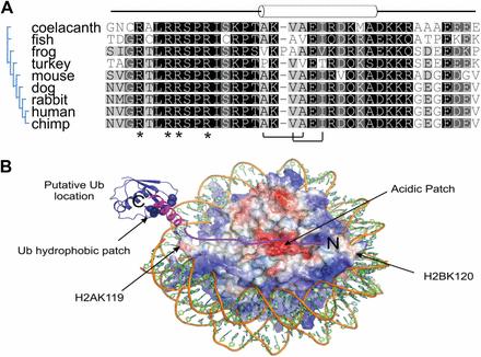 The UAB motif harbors features for interaction with H2AK119ub nucleosomes. (A) Sequence alignment of the UAB motif across species. Conserved amino acids are heighted in black or gray. The arginine residues likely involved in binding to the nucleosome acidic patch are marked with asterisks. The two clusters of conserved aliphatic residues potentially binding to the ubiquitin hydrophobic patch are indicated by bracket. (B) A structural modeling of the UAB motif complexed with H2AK119ub nucleosome. The UAB motif is shown in pink. The electrostatic potential of nucleosome core octamer is shown, where blue stands for positive charge and red for negative charge. The side chains of the residues in the ubiquitin hydrophobic patch are shown in spheres, and H2A/H2B ubiquitination sites are indicated with arrows. The distance of the acidic patch to H2BK120 is shorter than that to H2AK119, indicating that the spacing between arginine fingers and aliphatic clusters is important for the preferred binding to H2AK119ub nucleosomes.