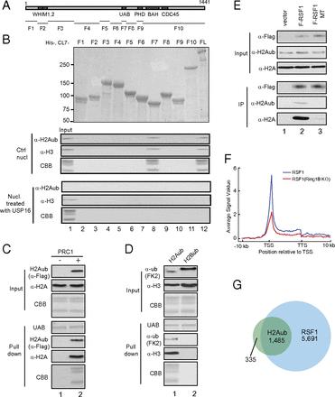 RSF1 binds H2Aub nucleosomes through a previously uncharacterized UAB domain. (A) Schematic representation of the RSF1 domain organization and fragments used in nucleosome pull-down assay. (B) The full-length and fragment 7 (amino acids 770–807) of RSF1 bind to H2Aub nucleosomes. (Top) CBB-stained protein gel containing purified full-length RSF1 and its serial fragments. F1: 1–97 aa; F2, 98–182 aa; F3, 183–397 aa; F4, 398–608 aa; F5, 609–690 aa; F6, 691–785 aa; F7, 770–807 aa; F8, 808–890 aa; F9, 891–941 aa; F10, 942–1,441 aa. (Middle) Pull-down assays show that only the full-length RSF1 and fragment 7 (designated as the UAB domain) bind to H2Aub nucleosomes. (Bottom) Treatment with the H2Aub-specific deubiquitinase USP16 abolishes binding of RSF1 and fragment 7 to the nucleosomes. (C) The UAB domain specifically pulls down reconstituted nucleosomes subjected to in vitro ubiquitination by PRC1 (lane 2), but not unmodified nucleosomes (lane 1). (D) The UAB domain specifically pulls down H2Aub (lane 1), but not H2Bub (lane 2) nucleosomes. (E) The UAB domain is required for RSF1 to interact with H2Aub nucleosomes in 293T cells. Cells were transfected with an empty vector or vectors expressing Flag-RSF1 or mutated Flag-RSF1 (MT) in which the UAB domain was in-frame deleted. Mononucleosomes were prepared and subjected to anti-Flag IP followed by immunoblots. (F) Metaplot of Flag-RSF1 in control (blue line) and Ring1B KO (red line) mouse ESCs. For all data, the minimum value is set to 0. The signal plot is normalized by subtracting IgG ChIP-seq signal from the same cell lines. Transcription start site (TSS) plus 10-kb upstream and transcription termination site (TTS) plus 10-kb downstream are shown. (G) Venn diagram shows the overlap between RSF1 bound genes and H2Aub marked genes in mouse ESCs. About 82% of H2Aub sites are bound by RSF1.