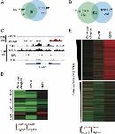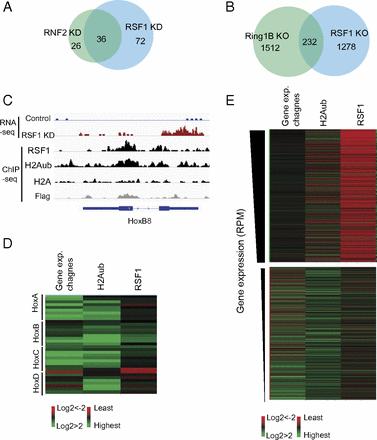 RSF1 and RNF2/Ring1B modulate the expression of a large cohort of common targets in human and mouse cells. (A) Venn diagram shows the overlap of the genes with significant changes in expression in RNF2 or RSF1 KD HeLa cells. (B) Venn diagram shows the overlap of the genes with significant changes in expression in Ring1B or RSF1 KO mouse ESCs. (C) Representative images of the HoxB8 gene locus showing data obtained from the RNA-seq (Top two panels), RSF1 ChIP-seq (third panel), and H2Aub ChIP-seq (fourth panel) assays in mouse ESCs containing RSF1-Flag-HA knockin. Parallel H2A and Flag ChIP in parental ESCs were shown as controls. Gene diagrams are shown (Bottom). (D) Heatmaps shows fold-changes of the expression of the Hox genes in RSF1 KO mouse ESCs compared with control wild-type ESCs from RNA-seq data (first column), tag counts for H2Aub ChIP-seq data (second column), and RSF1 ChIP-seq data (third column) in control wild-type ESCs within 5 kb of gene TSS. The tag counts are RPM-normalized and background-subtracted. (E) Heatmaps shows fold-changes in the expression of all genes in RSF1 KO mouse ESCs compared with wild-type control ESCs from RNA-seq data (first column), tag counts for H2Aub signal (second column), and RSF1 signal (third column) in control wild-type ESCs within 5 kb of gene TSS. Genes are ranked by their expression levels and only the top and bottom 1,000 genes are shown. The tag counts are RPM-normalized and background subtracted.