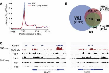 RSF1 binding overlaps with RNF2/Ring1B and H2Aub binding. (A) Metaplot of Flag-RSF1 in control (blue line) and Ring1B KO (red line) mouse ESCs. For all data, the minimum value is set to 0. The signal plot is normalized by subtracting Flag ChIP-seq signal from the parental ESC lines. TSS plus 10-kb upstream and TTS plus 10-kb downstream are shown. (B) Venn diagram showing the overlap of binding of RSF1 (blue), Ring1B (teal), and PRC2 (pink) in mouse ESCs. (C) Representative images of HoxB7 and HoxC6 genes with aligned tags from RNA-seq (Top two panels), RSF1 ChIP-seq (third panel), and H2Aub ChIP-seq (fourth panels) in mouse ESCs. Parallel H2A and Flag ChIP were shown as controls. Gene diagrams are shown at the Bottom.