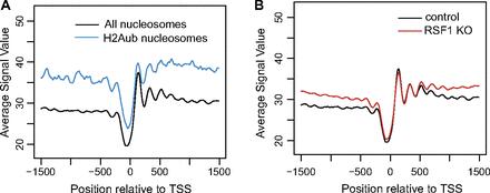 RSF1 is required for maintaining stable promoter nucleosome arrays. (A) Binding intensity of H2Aub nucleosomes (blue line) and all nucleosomes (black line) in mouse ESCs. (B) Binding intensity of all nucleosomes in control (black line) and RSF1 KO (red line) mouse ESCs.