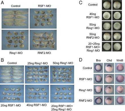 RSF1 collaborates with Ring1 to regulate mesodermal specification during early Xenopus embryogenesis. (A) Both RSF1 and Ring1 regulate Xenopus gastrulation. Injection of RSF1-MO (20 ng) and Ring1-MO (50 ng) induced similar gastrulation defects in Xenopus tadpoles, with embryos displaying short axis and open blastopore. In contrast, RNF2-MO induced a milder phenotype of bent axis and head defects. (B) RSF1-MO and Ring1-MO act cooperatively to induce gastrulation defects. A combination of low doses of Ring1-MO and RSF1-MO resulted in an embryonic phenotype that mimicked or surpassed that with the high doses of individual MOs. (C) At late gastrula stages, RSF1-MO and Ring1-MO cause delay in blastopore closure. Combination of low doses of RSF1-MO and Ring1-MO induced similar gastrulation defects as that when higher doses of individual MOs were used. RNF2-MO did not have obvious effects on blastopore closure. (D) In situ hybridization demonstrated that KD of RSF1 or Ring1 reduced mesodermal markers in a similar fashion. The pan-mesodermal gene Brachyury (Bra), the dorsal mesodermal marker Chordin (Chd), and the ventrolateral mesodermal marker Wnt8 were all reduced upon RSF1 or Ring1 KD. KD of RNF2 did not alter expression of these mesodermal markers. The embryos were injected with the MOs and the lineage tracer encoding nuclear β-Gal into the marginal zone of one cell at the two-cell stage, and the injected region was revealed by staining with the β-Gal substrate Red-Gal.