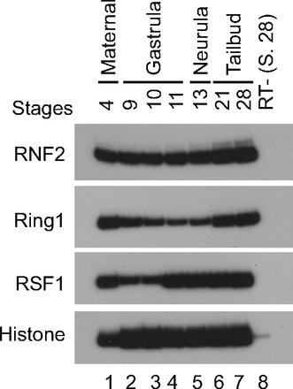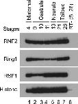 RSF1, Ring1, and RNF2, are expressed highly and widely during Xenopus embryonic development. Semiquantitative RT-PCR analyses of RSF1, Ring1, and RNF2 expression in Xenopus larvis at different stages of embryo development.