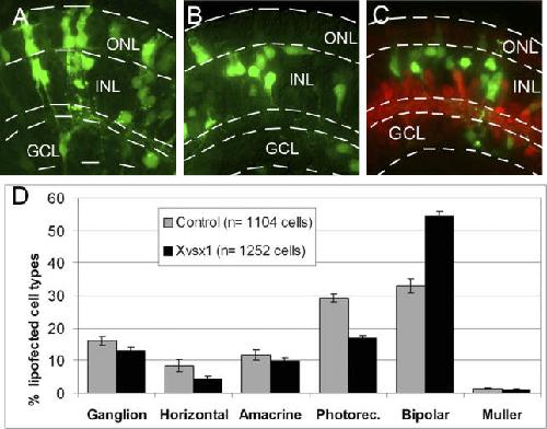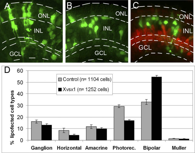 Figure 1. The Xenopus Xvsx1 Homeobox Gene Supports Bipolar Cell Fate(AâC) Sections of st. 42-lipofected retinas. GFP (green) traces lipofection. (A) Example of control lipofection. (B and C) Example of Xvsx1 lipofection. (C) Immunostaining (red fluorescence) with amacrine antibodies panel (anti-5-HT, anti-GABA, anti-tyrosine hydroxilase), labeling the main classes of amacrine cells at this developmental time [47,48] ONL: outer nuclear layer; INL: inner nuclear layer; GCL: ganglion cell layer. Xvsx1 lipofection (B) increases the proportion of INL cells and decreases the proportion of ONL cells compared to control (A). The majority of the Xvsx1-lipofected cells in the INL are not stained either by amacrine markers (C), or by the horizontal marker prox1 (not shown).(D) Statistical analysis showing the proportion of lipofected cell types. Cell types were identified as described [14]. Error bars indicate standard error of the mean. Xvsx1 misexpression increases the proportion of bipolar cells (from 33% of control to 55%, student's t-test, p = 0.000043), mainly at the expense of photoreceptors (from 29% to 14%, student's t-test, p = 0.000011). |
