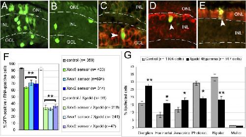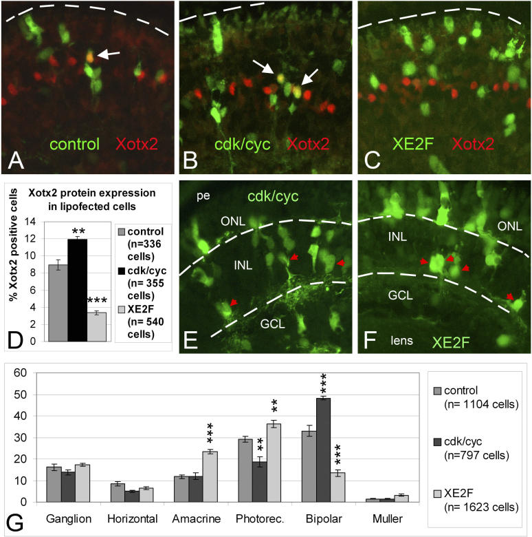 Figure 8. XE2F Lipofection Inhibits Xotx2 Translation and the Generation of Bipolar Cells(AâC) st. 40-lipofected retinas. Lipofected cells are traced by GFP (green), Xotx2 immunostaining in red. Arrows indicate Xotx2-positive lipofected cells.(D) Histogram showing the proportion of retinal lipofected cells expressing Xotx2 protein. Number of counted cells is indicated by n. Double asterisk indicates p = 0.009; triple asterisk indicates p = 0.0001 (student's t-test); error bars indicate standard error of the mean.(EâG) Cell type analysis of lipofected retinas at st. 42. Examples are shown of retinas lipofected with cdk2/cyclinA2 (cdk/cyc in [E]) and XE2F (F). GCL: ganglion cell layer; INL: inner nuclear layer; ONL: outer nuclear layer; pe, pigmented epithelium. Red arrowheads point at cells with amacrine morphology, which represent the majority of cell types in the INL of XE2F-lipofected retinas. Bars in (G) show the proportion of lipofected cells types at st. 42. Number of counted cells is indicated by n; double asterisk indicates p ⤠0.01; triple asterisk indicates p ⤠0.001 (student's t-test); error bars: standard error of the mean. The lipofection of cdk2/cyclinA2 and XE2F increases and decreases, respectively, the proportion of bipolar cells compared to control. The decrease of photoreceptors after cdk2/cyclinA2 lipofection is due to a reduction of cones [18]. |
