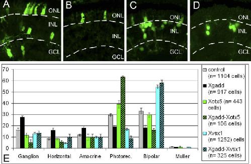 Figure 7. Xotx5b and Xvsx1 Counteract the Inhibitory Effects of Xgadd-45γ on the Differentiation of Photoreceptors and Bipolar Cells(AâD) Examples of retinal sections from embryos lipofected with Xotx5b (A), Xotx5b and Xgadd-45γ (B), Xvsx1 (C), and Xvsx1 and Xgadd-45γ (D). ONL, outer nuclear layer; INL, inner nuclear layer; GCL, ganglion cell layer.(E) Statistical analysis showing the proportion of lipofected cell types after lipofection of the constructs indicated in legend. Number of lipofected cells is indicated by n. Error bars indicate standard error of the mean. |