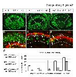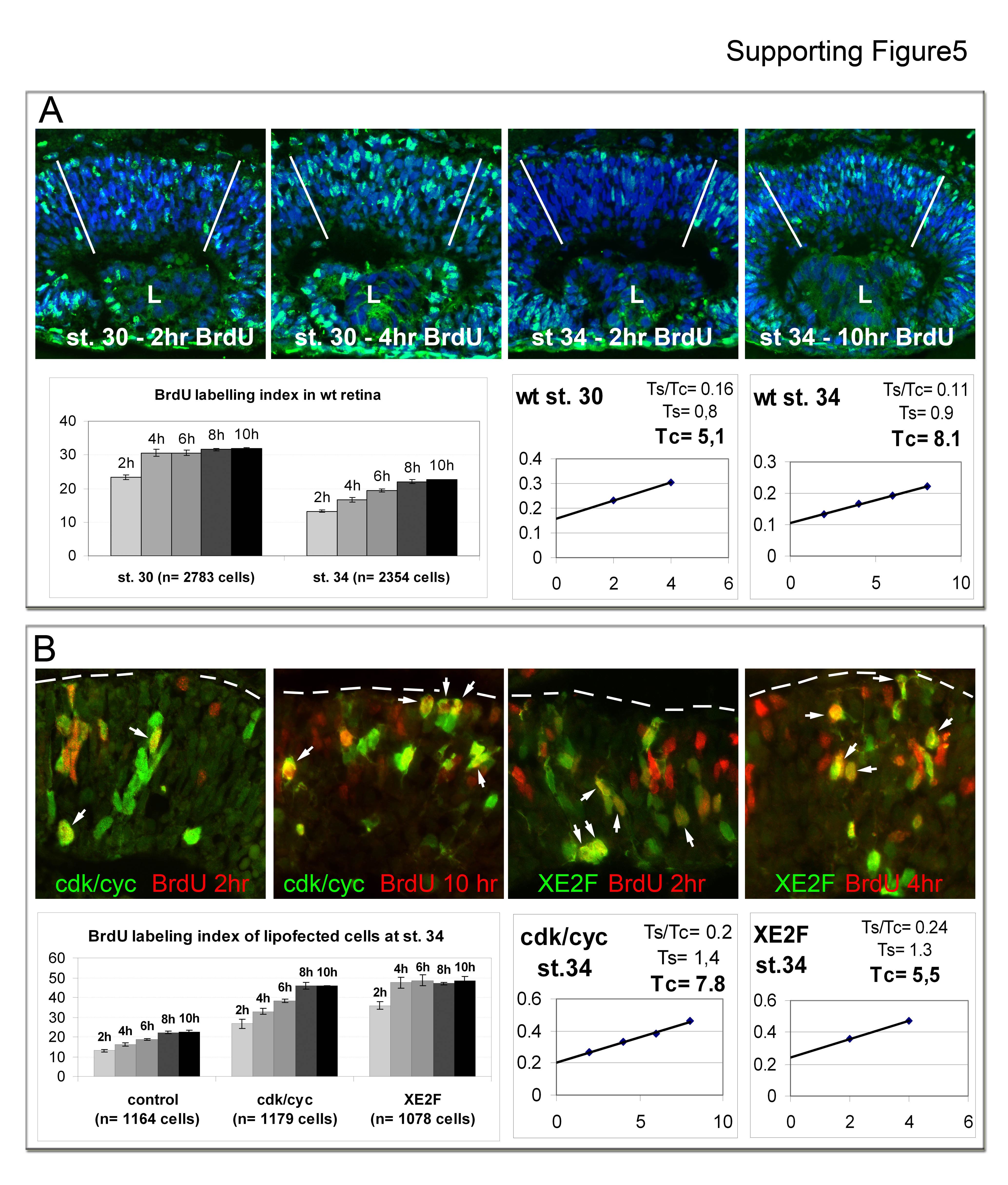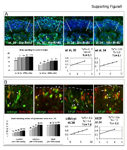 Figure S5. LI Analysis (A and B) Analyses of the BrdU-LI (the proportion of BrdU-labeled cells) in wild-type (wt) (A) and lipofected (B) retinas. BrdU was injected and detected as described [19,31]. Images in (A) show examples of retinal sections of wt embryos, after different times of BrdU in incorporation (h BrdU) starting from st. 30 and st. 34. White lines demarcate the central retinal region that was considered for quantitative analysis. BrdU-positive nuclei are detectable in green among DAPI-stained (blue) nuclei. L: lens. Images in (B) show magnifications of retinas (bordered by dashed lines) lipofected at st. 17 with cdk2/cyclinA2 (cdk/cyc [18]), or with XE2F [42], after BrdU cumulative incorporation from st. 34. White arrows point at BrdU-positive nuclei (detectable in red) of lipofected cells (detectable in green). Histograms show the percentage of BrdU-immunopositive cells among DAPI-positive cells (A), or lipofected cells (B), after cumulative BrdU incorporation; h indicates the time of incorporation (in hours); n reports the total number of cells counted; and error bars show standard error of the mean. Diagrams show the linear function used to calculate the length of the cell cycle, according to Takahashi et al. [39]; abscissae indicate time (in hours); ordinates show LI of wt (A) or lipofected (B) cells; and Tc and Ts estimate the duration in hours of cell cycle and S phase, respectively. Tc and Ts of control-lipofected cells (not shown) are virtually the same as those of st. 34 wt cells. In wt retinas, the proportion of cycling cells, expressed as 10 h LI, is higher at st. 30 (32% ± 0.34% standard error of the mean) than at st. 34 (23% ± 0.1% standard error of the mean). This proportion, at st. 34, is even higher in cdk2/cyclinA2âlipofected cells (45% ± 0.1% standard error of the mean) and in XE2F-lipofected cells (48% ± 2% standard error of the mean), which both delay the exit from the cell cycle. In wt retinas, the average cell cycle length, as evaluated by Tc value, increases from st. 30 (Tc = 5.1 ± 1.3 h) to st. 34 (Tc = 8.1 ± 0.6 h). Notably at st. 34, XE2F lipofection significantly reduces Tc (Tc = 5.5 ± 1.2 h) compared to control cells of the same age (Tc = 8.1 ± 0.6 h), whereas Tc is not significantly affected by cdk2/cyclinA2 lipofection (Tc = 7.8 ± 0.9 h). The changes in Tc observed among different types of cells are poorly affected by Ts, which ranges from 0.9 to 1.4. https://doi.org/10.1371/journal.pbio.0040272.sg005 |