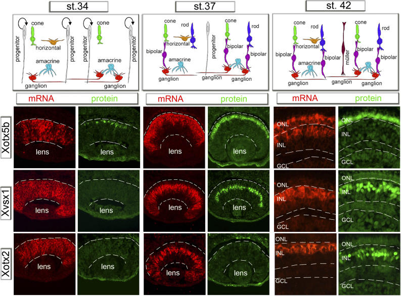 Figure 2. The Translation of the Xenopus Homeobox Xotx5b, Xvsx1, and Xotx2 mRNAs Parallels the Generation of Photoreceptors and Bipolar CellsIn situ hybridization of Xotx2, Xotx5b, and Xvsx1 mRNAs (Fast Red detection) compared to immunostaining of the corresponding proteins (green detection) on serial 10-μm sections of embryonic retinas at st. 34 (mid-neurogenesis), st. 37 (late-neurogenesis), and st. 42 (mature embryonic retina). Schematics show the retinal cell types present at the corresponding times of analysis (see also Figure S2). Dashed lines border the entire thickness of neural retinas (st. 34â37), or indicate the boundaries between different cell layers (st. 42, magnification of central retinal aspect); GCL: ganglion cell layer, INL: inner nuclear layer, ONL: outer nuclear layer. |