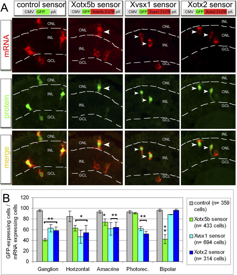 Figure 3. The 3â² UTRs of Xotx5b, Xvsx1, and Xotx2 mRNA Direct Cell TypeâSpecific Inhibition of Translation(A) Detection of sensor mRNAs (Fast Red), sensor GFP protein (green immunodetection), or co-detection of both mRNA and protein (merge, yellow), in cells of mature retinas (st. 42) lipofected with GFP control vector, or UTR-carrying sensor vectors (see Materials and Methods). Unlike control GFP, sensor GFP translation is detectable (arrowheads) mainly in photoreceptors (Xotx5b sensor) or bipolar cells (Xvsx1 and Xotx2 sensors). ONL: outer nuclear layer; INL: inner nuclear layer; GCL: ganglion cell layer.(B) Bars show the proportion of sensor-translating/sensor-transcribing cell types. Number of cells is indicated by n. Error bars represent standard error of the mean. Single asterisk indicates p ⤠0.05; double asterisk indicates p ⤠0.01 (student's t-test). |