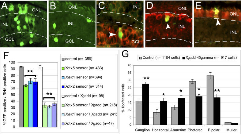 Figure 6. Cell Cycle Inhibiton by Xgadd-45γ Lipofection Affects Translation and Cell Fate(AâE) Retinal sections (st. 42) of control-lipofected retinas (A) or Xgadd-45γâlipofected retinas (BâE). Xgadd-45γ lipofection decreases the size of lipofected cell clusters. (CâE) Show lipofected cells (GFP-traced) counterstained (arrowheads) with cell type markers: (C) ganglion cells (Fast Red mRNA detection of hermes), (D) horizontal cells (Fast Red mRNA detection of prox1), (E) cones (calbindin red immunodetection). ONL: outer nuclear layer; INL: inner nuclear layer; GCL: ganglion cell layer.(F and G) Bars indicate the proportions of lipofected cells translating sensors (F). Bars showing the proportions of lipofected cell types at st. 42 are indicated by (G). Number of counted cells is indicated by n; single asterisk indicates p ⤠0.05; double asterisk indicates p ⤠0.01 (student's t-test); error bars: standard error of the mean. |