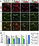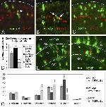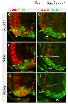 Figure S2. Neurogenetic Timing in Xenopus Embryonic Retina To investigate the cell birth date (that is the time of exit from the cell cycle) of different retinal cells, we labeled dividing retinal progenitors by BrdU intrabdominal injections [19] from st. 30, st. 34, and st. 37, and analyzed their differentiation fates at st. 42 (mature embryonic retina). As the generation of the Xenopus Müller glia, which is the last retinal cell type to exit from the cell cycle, was extensively investigated both in terms of cell birth date and at the molecular level [31], we focused our attention on retinal neurons. (AâC) Examples of st. 42 retinal sections immunostained for BrdU (green signal). Dashed lines enclose the central part of retina that was considered for statistical analysis. (DâF) Magnifications of st. 42 retinal sections in which BrdU (green) was co-detected with specific retinal markers (Fast Red mRNA detection). White arrows point to double-labeled cells. The following markers were used to identify different cell types: hermes [32] for ganglion cells (D), prox1 [11] for horizontal cells (not shown), amacrine antibodies panel (anti-5-HT, anti-GABA, anti-tyrosine hydroxilase) as in Figure 1 (not shown), IRBP [33] for the external segment of photoreceptors (E), Xvsx1 (F), and Xotx2 (not shown) for bipolar cells. ONL: outer nuclear layer; INL: inner nuclear layer; GCL: ganglion cell layer. (G) Bars show the proportion of each cell type that was still dividing at the time of BrdU injection. Error bars show standard error of the mean. We classified the BrdU-positive cells according to their morphology, position in the retinal layers, and expression of markers. The cell birth dates of the different Xenopus retinal neurons are partially overlapping. Nonetheless, rods among photoreceptors [21] and bipolar cells show the latest cell birth dates. A substantial proportion of their progenitors are still dividing (being BrdU-positive) at st. 34 (24% photoreceptors and 63% bipolar). At this stage, only a few ganglion, horizontal, and amacrine progenitors are still dividing (6%, 5%, and 12%, respectively). Bipolar cells are the latest neurons, as the majority of them (63%) are still dividing at st. 34. https://doi.org/10.1371/journal.pbio.0040272.sg002 |