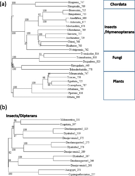 Fig. 1. Phylogenetic trees of TPX2 homologs. a Phylogenetic tree of full length orthologs of TPX2 in representative species. b Phylogenetic tree of short orthologs of TPX2 in representative dipteran species. Drosophila has three paralogs. The labels indicate species and length of the protein. Numbers in the tree represent bootstrapping values. The sequences and NCBI identifiers are available as Additional file 1 and Additional file 3 for (a) and (b), respectively. The multiple sequence alignments used to do the phylogenetic trees are available as Additional file 2 and Additional file 4 for (a) and (b), respectively