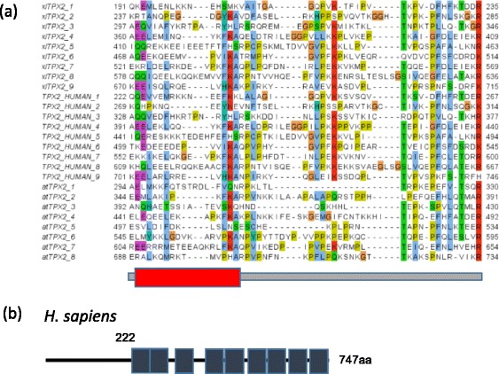 Fig. 2. Repeats in TPX2 proteins. a Multiple sequence alignment of tandem repeats in Xenopus laevis, human and A. thaliana TPX2. The red box indicates a summary of predictions for an alpha-helix (see Methods for details). b Position of repeats in human TPX2. UniProt database identifiers are Q6NUF4 for xlTPX2, Q9ULW0 for TPX2_HUMAN, and F4I2H7 for atTPX2. The multiple sequence alignment is available as Additional file 5