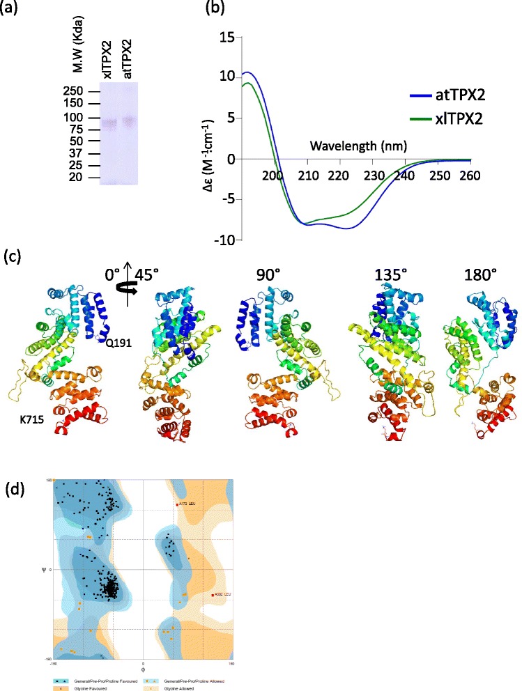 Fig. 3. Biochemical and structural analysis of TPX2. a SDS-PAGE analysis of Xenopus and Arabidopsis TPX2 proteins. b Spectra in the region of 260–190 nm were obtained at 25 °C for full length xlTPX2 and atTPX2. Both spectra present a typical alpha helical profile with two minima (λ208 and λ222 nm). c Molecular model of xlTPX2 (Q191-K715) represent a compact structure of repeated α-helices linked by a flexible loop. d Ramachandran plot of the xlTPX2 model. About 96 % of all residues were in favored regions, and about 4 % of the residues were in an allowed region. Two outliers were found, Leucines at positions 173 and 302, although, visual inspection did not reveal any steric clash