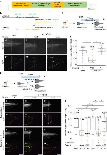 Figure 3. Rescue experiment of the phenotype of il-11 KD tadpoles. a Schematic drawing of a rescue construct. Yellow boxes represent cis-regulatory elements, and green boxes represent coding sequences. gRNA #1U.LS target site was inserted in the construct. In the control construct, acgfp was inserted instead of il-11-p2a peptide-acgfp. b Schematic drawing of knock-in and knockdown. Bars: introns, orange boxes: untranslated regions, blue boxes: coding sequences, dark grey arrows: gRNA target sequences. c Schematic drawing of a rescue experiment. dâj Representative images of tails of control cas9 mRNA-injected d, e, il-11 knockeddown acgfp-expressing f, g, or il-11 knockeddown il-11âexpressing h, i tadpoles, and their regeneration length j are shown. k, Schematic drawing of a rescue experiment using tadpoles treated with or without doxycycline. l-x Representative images of tails of untreated cas9 mRNA-injected l, m, il-11 knockeddown acgfp-expressing n, o, or il-11 knockeddown il-11âexpressing p, q tadpoles, or doxycycline-treated cas9 mRNA-injected r, s, il-11 knockeddown acgfp-expressing t, u, or il-11 knockeddown il-11âexpressing v, w tadpoles and their regeneration length x are shown. Dark-field images d, f, h, l, n, p, r, t, v and GFP2-filtered images e, g, i, m, o, q, s, u, w are shown. Regeneration length was normalised by snout to vent length (SVL). Box plots are inserted in the panels. Bars in the boxes represent median, upper and lower limits of the boxes represent the first and third quartiles, and whiskers represent maximum and minimum values. Scale bars: 1âmm. Anterior is to the left, dorsal is up. Yellow broken lines indicate outline of the tails. White broken lines indicate amputated plane. *Pâ<â0.05, TukeyâKramerâs test