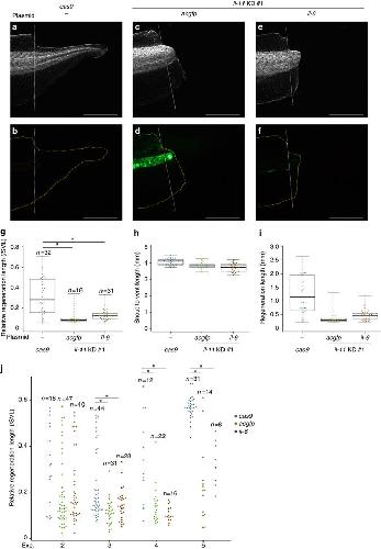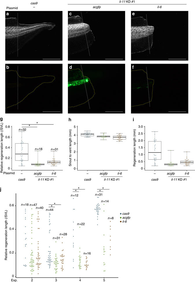 Figure 4. il-6 does not rescue the shortened regeneration length of il-11 KD tadpoles. aâf Representative images of tails of control cas9 mRNA-injected a, b, il-11 knockeddown acgfp-expressing c, d, or il-11 knockeddown il-6âexpressing e, f tadpoles, and their regeneration length g are shown. Dark-field images a, c, e and GFP2-filtered images b, d, f are shown. Regeneration length was normalised by snout to vent length (SVL). h, i, SVL h and regeneration length i used for calculation in g are shown. j Biological replicates using different batches of tadpoles are shown. Box plots are inserted in the panels. Bars in the boxes represent median, upper and lower limits of the boxes represent the first and third quartiles, and whiskers represent maximum and minimum values. Scale bars: 1âmm. Anterior is to the left, dorsal is up. Yellow broken lines indicate outline of the tails. White broken lines indicate amputated plane. *Pâ<â0.05, TukeyâKramerâs test