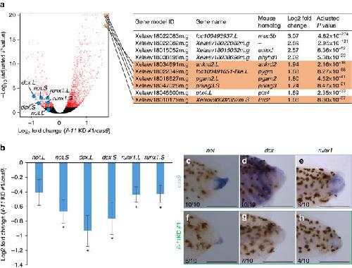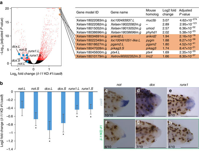 Figure 5. il-11 induces or maintains tissue progenitor cells across cell lineages during tail regeneration. a Gene expression profile of il-11 KD #1 and cas9 tadpoles. Left panel: volcano plot. Fold-change of expression level of il-11 KD #1 tadpoles over control tadpoles measured by RNA-sequencing are plotted on horizontal axis in log2 scale, and adjusted P-values are plotted on vertical axis in âlog10 scale. Genes with significant fold-changes (adjusted Pâ<â0.05) are plotted in red. Points beyond the range are plotted on the edge of the graph. Representative undifferentiated markers are plotted in blue. Right panel: top 10 genes which showed highest upregulation in il-11 KD #1 are listed. Mouse homologues of genes indicated in orange are reported to be selectively expressed in skeletal muscle in mice (Supplementary Fig. 7). These genes correspond to orange plots in the left panel. b Fold-change of expression levels of representative undifferentiated markers measured by RNA-sequencing. Meanâ±âs.e.m. nâ=â3. *adjusted Pâ<â0.05, Wald test. câh, Localisation of undifferentiated markers. Representative WISH images for not c, f, dcx d, g, or runx1 e, h in control câe or il-11 KD #1 tadpoles fâh are shown. Anterior is to the left, dorsal is up. Blue/purple colour represents signals for the genes. Brown pigments are melanophores of the tadpoles. Scale bars: 500âμm. Numbers at the bottom corner indicate the total ratio of tadpoles showing the corresponding expression pattern from two batches