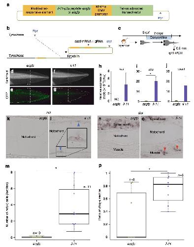 Fig. 6 il-11 is sufficient for induction of progenitor cells across cell lineages in intact tadpole tail. a Schematic drawing of a construct for forced expression of il-11. Yellow boxes represent cis-regulatory elements, and green boxes represent coding sequences. gRNA #tyr target site was inserted in the construct. In the control construct, acgfp was inserted instead of il-11-p2a peptide-acgfp. b Schematic drawing of knock-in. Dark grey arrows: gRNA #tyr target sequences. c Schematic drawing of a gain of function experiment. dâg, Representative images of tadpoles used in this experiment. acgfp-d, e or il-11-f, g expressing tails 2 days after doxycycline treatment are shown. Tail tissues indicated in white broken lines from approximately 10 tadpoles were used for qRT-PCR. Dark-field images d, f and GFP2-filtered images e, g are shown. Scale bars: 1 mm. Anterior is to the left, dorsal is up. Yellow broken lines indicate outline of the tails. hâj, Expression levels of not h, dcx i, or runx1 j in tails expressing acgfp or il-11 were measured by qRT-PCR. Vertical axes represent relative expression levels normalised by those of ef1α. Mean ± s.e.m. n = 3. k, l, n, o, Representative ISH images for not k, l or dcx n, o in acgfp k, n or il-11 l, o-expressing intact tadpole tails 2 days after doxycycline treatment are shown. Several not-expressing cells in the notochord sheath (blue arrowheads) and dcx-expressing muscle (red arrowheads) were detected in il-11âexpressing tails. m The number of not-expressing cells in the notochord sheath in all sections containing notochord was counted. p The ratio of sections containing dcx-expressing muscle in all sections containing muscle was calculated. Box plots are inserted in the panels. Bars in the boxes represent median, upper and lower limits of the boxes represent the first and third quartiles, and whiskers represent maximum and minimum values. Scale bars: 100 μm except inset in (l) (10 μm). Anterior is to the left, dorsal is up. Magenta/purple colour represents signals for the genes. Inset: magnified view of boxed area. *P < 0.05, Studentâs t-test. ND: not detected