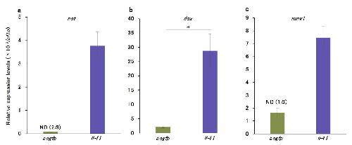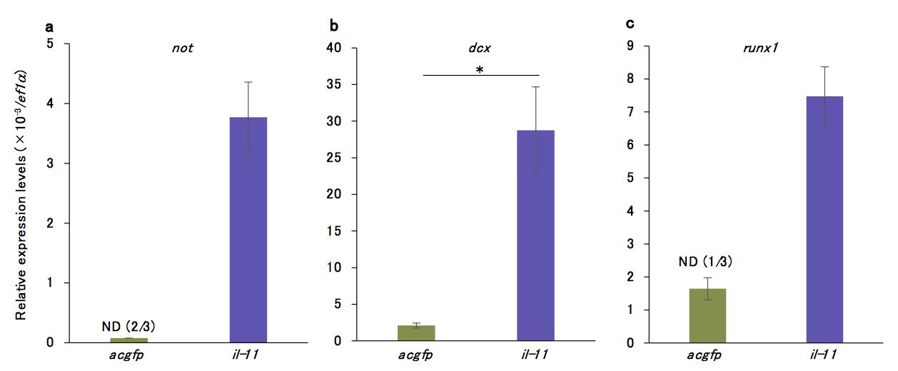 Biological replicates for Fig. 6h-j using tadpoles from a different batch. Expression levels of not (a), dcx (b), or runx1 (c) were measured by qRT-PCR. Four to six tadpoles were used in each lot. Vertical axes represent relative expression levels normalised by those of ef1α. Mean ± s.e.m. n=3. *P < 0.05, Studentâs t-test. RT-PCR signal for not (a) or runx1 (c) was not detected in two or one samples in acgfp-expressing tails due to low expression levels.
