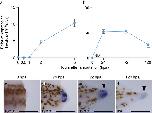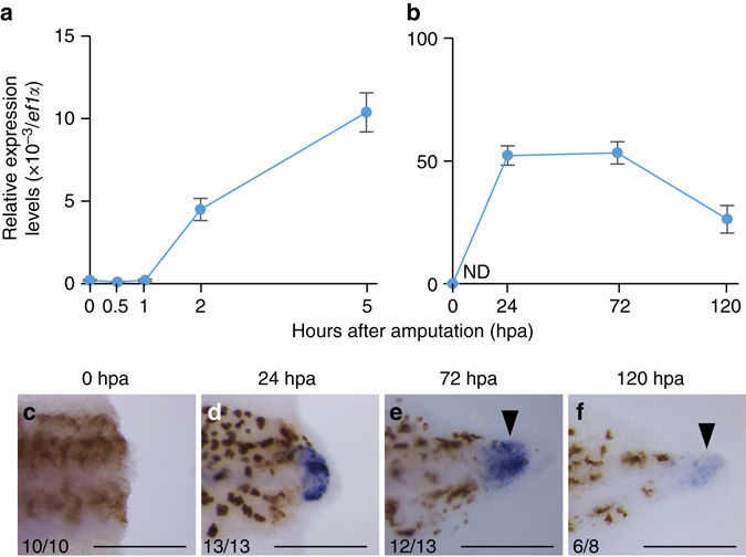 Figure 1. il-11 is expressed at the tip of blastema during tail regeneration. a, b Expression levels of il-11 were measured by qRT-PCR using RNA extracted from ~20 tadpoles. Tail stump tissues cut at the level of 0.5âmm anterior from the amputated plane were used. Vertical axes represent relative expression levels of il-11 normalised by those of ef1α. Meanâ±âs.e.m. nâ=â4. ND: not detected. câf WISH was performed using tadpoles fixed at 0 c, 24 d, 72 e, or 120âhpa f. Anterior is to the left and dorsal is up. Blue/purple colour represents signals for il-11 expression. Brown pigments are melanophores of the tadpoles. Scale bars: 500âμm. Numbers at the bottom corner indicate the total ratio of tadpoles showing the corresponding expression pattern from at least two batches. Note that il-11 was expressed at the blastema tip at 72 and 120âhpa (black arrowheads)