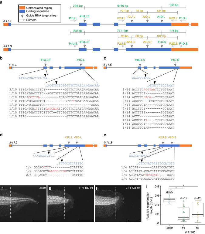 Figure 2. Knockdown of il-11 in tadpoles. a Schematic drawing of genomic structure of il-11. Bars: introns, orange boxes: untranslated regions, blue boxes: coding sequences, dark grey vertical arrows: gRNA target sequences, light grey horizontal arrows: primers. bâe, Genomic sequences of tadpoles injected with cas9 mRNA and gRNAs. Genomic DNA was extracted from all body of il-11 KD #1 tailbud embryos b, c or tail of il-11 KD #2 tadpoles d, e, and sequences corresponding to il-11.L b, d or il-11.S c, e were PCR-amplified using P1U.L/P1D.L b, P1U.S/P1D.S c, P2U.L/P2D.L d, or P2U.S/P2D.S e primers. The PCR product of the expected length corresponding to deletion of the region between two gRNA target sites was sequenced. Blue characters: reference genomic sequences nearby gRNA target sites, red characters: mismatches from reference genomic sequences, bars: gaps, arrowheads: predicted cleavage sites. Numbers at the left corner indicates ratio of clones containing the sequence to total clones sequenced. fâi, Representative images of tails of control cas9 mRNA-injected f, il-11 KD #1 g, or il-11 KD #2 h tadpoles at 7âdpa, and the tail regeneration length i are shown. Dark-field images fâh are shown. Anterior is to the left, dorsal is up. White broken lines indicate amputated plane. Scale bars: 1âmm. Regeneration length was normalised by snout to vent length (SVL). Box plots are inserted in the panels. Bars in the boxes represent median, upper and lower limits of the boxes represent the first and third quartiles, and whiskers represent maximum and minimum values. *Pâ<â0.05, Dunnettâs test