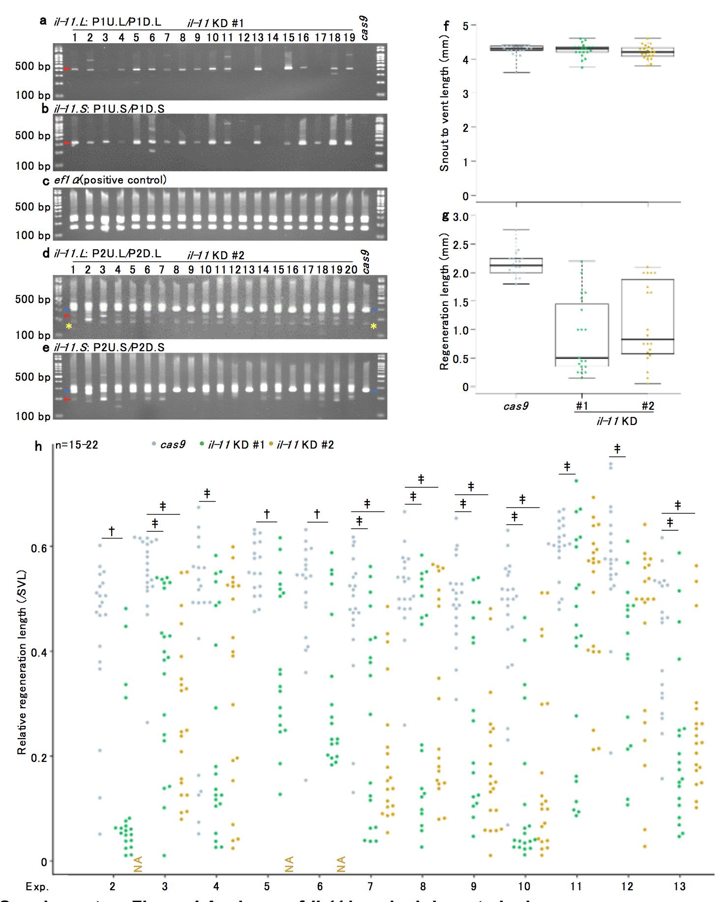 a-e, Genotyping of tadpoles used in Fig. 2i. Genomic DNA was extracted from tail stump tissues cut at the level 0.5 mm anterior from the amputated plane after measurement of regeneration length, and sequences corresponding to il-11.L (a, d), il-11.S (b, e), or positive control ef1a (c) were PCR-amplified. Individual identification numbers are indicated on top. Sizes of DNA markers were (from bottom to top) 100, 200, 300, 400, 500, 600, 700, 800, 900, 1000, 1500, and 3000 bp. If the genomic region between two gRNA target sites is deleted, a band will be detected as indicated by the red arrowhead. Blue arrowheads correspond to wild-type sequences. Yellow asterisks: non-specific bands. f, g, Snout to vent length (SVL, f) and regeneration length (g) used for calculation in Fig. 2i are shown. h, Biological replicates for Fig. 2i are shown. Different batches of tadpoles were used in each experiment (Exp.). Box plots are inserted in the panels. Bars in the boxes represent median, upper and lower limits of the boxes represent the first and third quartiles, and whiskers represent maximum and minimum values. â P < 0.05, Studentâs t-test. â P < 0.05, Dunnettâs test. NA: not analysed.