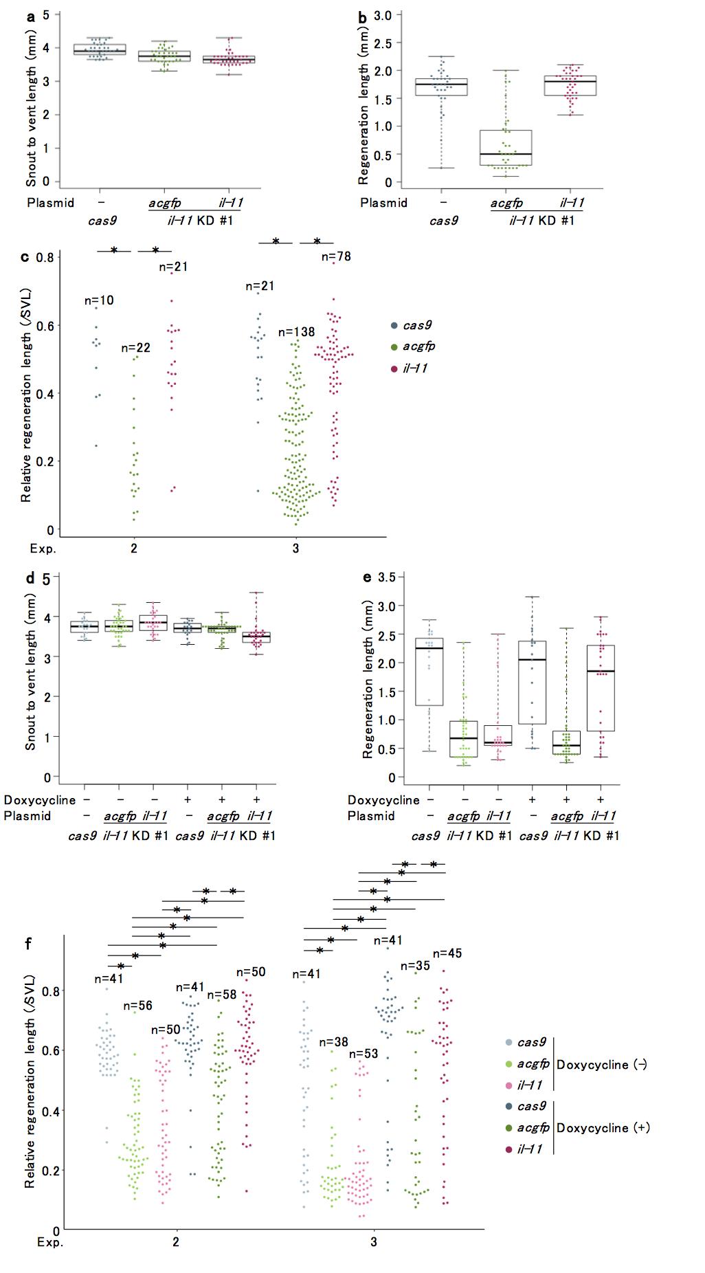 a, b, d, e, Snout to vent length (SVL, a, d) and regeneration length (b, e) used for calculation in Fig. 3j (a, b) or Fig. 3x (d, e) are shown. c, f, Biological replicates for Fig. 3j (c) or Fig. 3x (f) using different batches of tadpoles are shown. Box plots are inserted in the panels. Bars in the boxes represent median, upper and lower limits of the boxes represent the first and third quartiles, and whiskers represent maximum and minimum values.*P < 0.05, Tukey-Kramerâs test.