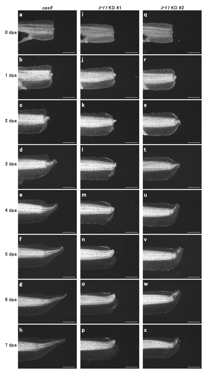 Time-lapse images of a cas9 mRNA-injected (a-h), il-11 KD #1 (i-p), or #2 (q-x) tadpole are shown. Images were taken at 0 (a, i, q), 1 (b, j, r), 2 (c, k, s), 3 (d, l, t), 4 (e, m, u), 5 (f, n, v), 6 (g, o, w), and 7 (h, p, x) dpa. Anterior is to the left, dorsal is top. Scale bars: 1 mm.