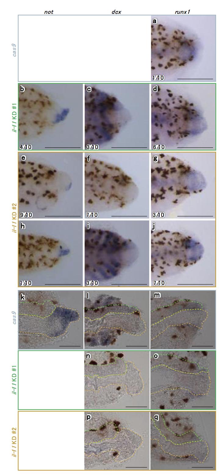 WISH images for not (e and h), dcx (f and i), or runx1 (g and j) are shown. k-q, Section images. Representative images for not (k), dcx (l, n and p), or runx1 (m, o and q) using cas9 mRNA-injected (k-m), il-11 KD #1 (n and o), or #2 (p and q) are shown. Anterior is to the left and dorsal is up. Blue/purple colour represents signals for each gene. Brown pigments are melanophores of the tadpoles. Scale bars: 500 μm (a-j) or 100 μm (k-q). Numbers at the bottom corner are the total ratio of tadpoles showing the corresponding expression from two batches. Green broken lines indicate spinal cord and spinal cord ampulla, and yellow broken lines indicate notochord and notochord bud.