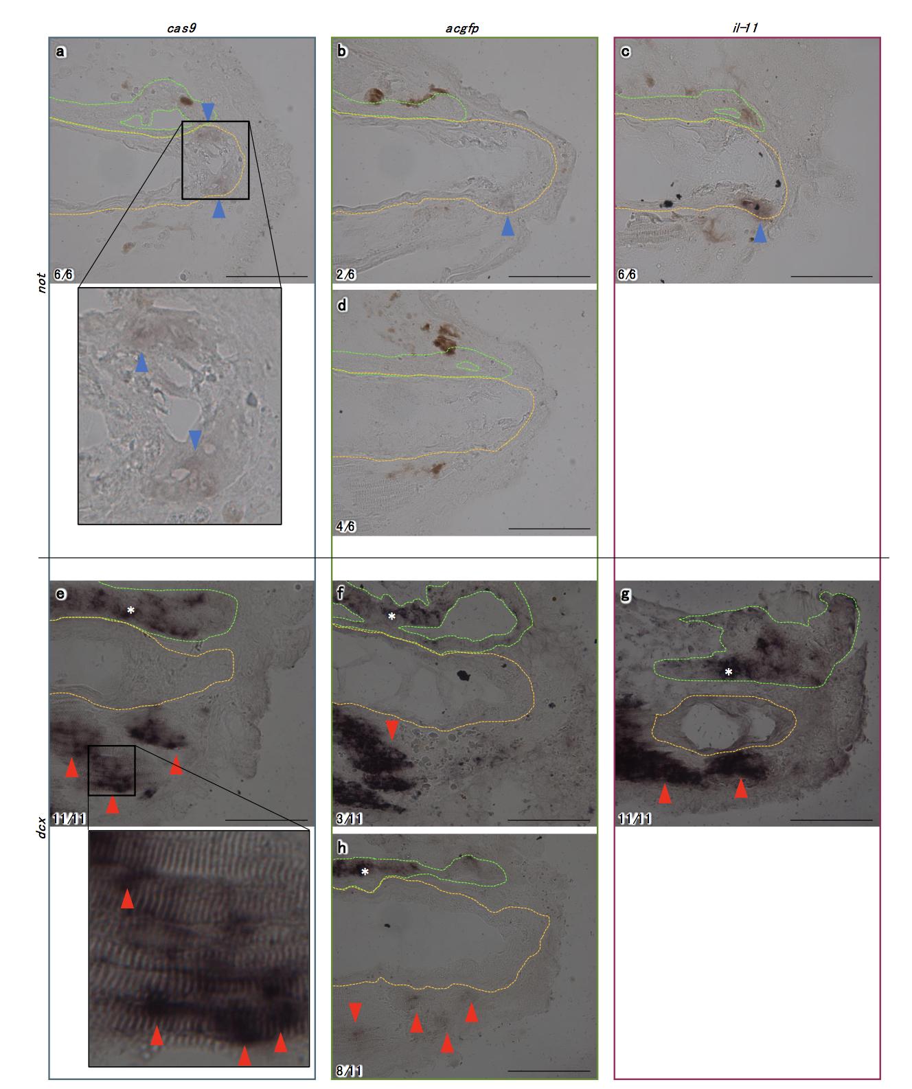 ISH images for not (a-d) or dcx (e-h). cas9 mRNA injected (a, e), acgfp (b, d, f, h) or il-11 (c, g)-expressing il-11 KD tadpoles were fixed at 2 dpa, and sagittally sliced. Anterior is to the left, dorsal is up. Scale bars: 100 μm. Magenta/purple colour represents signals for the genes. Brown pigments are melanophores of the