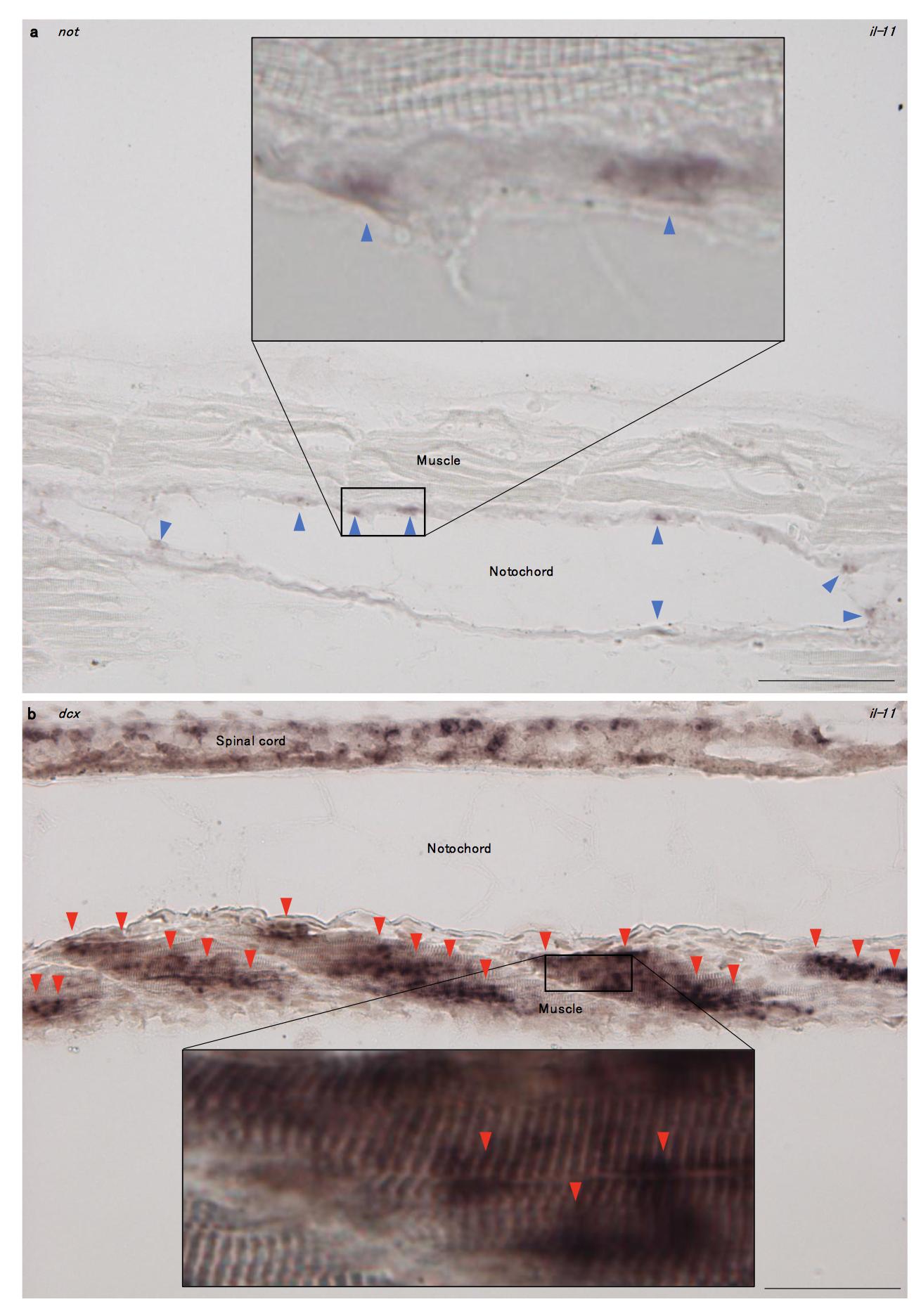 Biological replicates for Fig. 6l and o. Representative ISH images for not (a) or dcx (b) in il-11-expressing intact tadpole tails 2 days after doxycycline treatment are shown. Several not-expressing cells in the notochord sheath (blue arrowheads), and dcx-expressing muscle (red arrowheads) were detected. Scale bars: 100 μm. Anterior is to the left, dorsal is up. Magenta/purple colour represents signals for the genes. Inset: magnified view of boxed area.