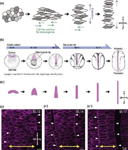 Figure 1. Convergent extension (CE) during the formation of Xenopus laevis notochord. (a) General cell movements exhibited during CE. The cells move bidirectionally along the future short axis of the elongating tissue (horizontal axis in this scheme, green arrows) and intercalate between each other. The continuous intercalation allows the tissue to elongate along the perpendicular axis (blue arrows). (b, bâ²) Notochord formation during gastrulation in the X. laevis embryo. The region that develops into the notochord is marked with a pink color. The notochord elongates along the anteroposterior axis of the embryo by cells intercalating along the mediolateral axis. (câc") Immunostaining of embryos injected with membrane-GFP mRNA. The notochord dramatically narrows during neurulation. Arrowheads indicate notochordâsomite boundary, and the yellow arrows indicate the width of the notochord. A, anterior; P, posterior; M, medial; L, lateral; St, embryonic stage. |