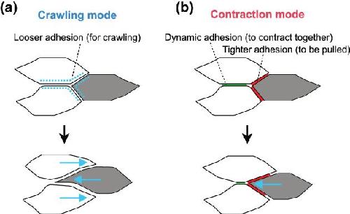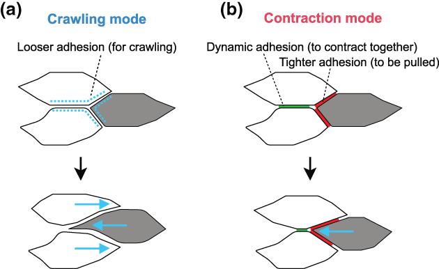 Figure 5. Cell adhesion properties for the two modes of convergent extension. (a) Cell adhesion properties suggested for the crawling mode. Loose adhesion is required for the cell (colored gray) to crawl between neighboring cells (colored white). (b) Cell adhesion properties suggested for the contraction mode. Dynamic adhesion (green line) is required for the cells (colored white) to attach together and shrink the shared cell–cell junction, while not impeding contraction. Tighter adhesion (red line) between the cells exhibiting cell–cell junction shrinkage (white) and the cells consequently being pulled (colored gray) is required for the cell (gray) to be pulled by the contraction occurring between cells (white). |