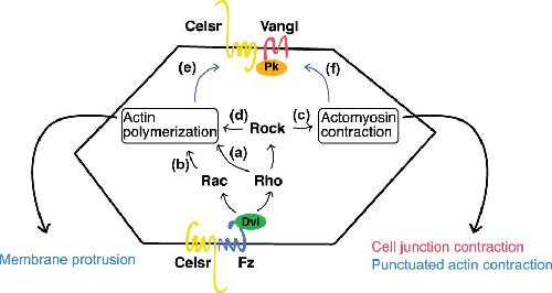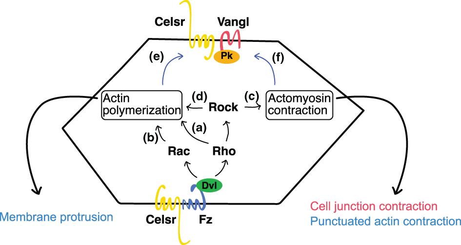 Figure 6. Planar cell polarity (PCP) pathway regulates actin dynamics via small guanosine triphosphatases (GTPases). Downstream pathways of the PCP pathway for cytoskeletal regulations. Activation of (a) actin polymerizing factor Daam1 by Rho, and (b) actin branching factor Arp3 by Rac. (c) Phosphorylation of myosin light chain (Myl) by Rho and Rock (Rho-Rock-Myl cascade). (d) Phosphorylation and activation of LIM-kinase (LIMK) controlling F-actin severing cofilin function by Rho and Rock. (e) A feedback loop of cofilin on PCP proteins. (f) A feedback loop of contractile forces of actomyosin on PCP proteins. |