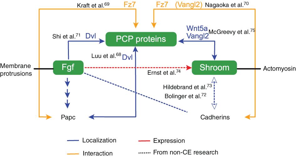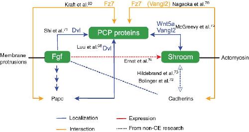 Figure 7. Interplay between the regulators of cytoskeleton components and cell adhesion molecules. Interplay between the planar cell polarity (PCP) pathway, Shroom, and fibroblast growth factors (FGF) for the regulation of downstream cytoskeleton components and cell adhesion molecules. The nature of each relationship is classified by localization (blue line), expression (red line), or physical interaction (yellow line). Solid and dotted lines are indicative of the relationship being demonstrated by studies investigating convergent extension (CE) and non-CE, respectively. |