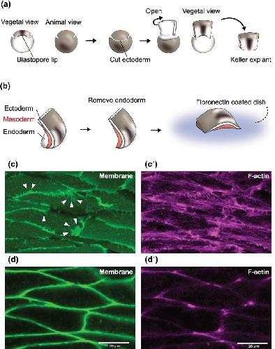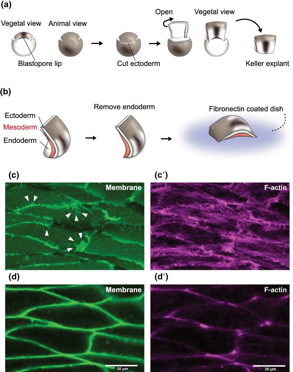 Figure 8. Tissue explant isolation from Xenopus laevis embryos for live imaging. (a) Procedure of isolating Keller explants. The explant is cut out at embryonic stage 10.5. Incisions are made on both sides of the blastopore lip, and the dorsal region is opened after cutting the ectoderm. The dorsal region is discerned by cutting along the blastopore lip. (b) Trimming the Keller explant and imaging the notochord. The endoderm is removed to expose the mesoderm (notochord) before mounting on a fibronectin-coated dish. The mesoderm is placed face down for the purpose of live imaging through inverted confocal microscopy. (c–d′) Images of the cell membrane and F-actin captured by live imaging of Keller explants. (c) and (c′) are images of the cells at the surface of the explant, where the cells adhere to the fibronectin. (d) and (d)′ are images of the same cells as in (c) and (c′), but focused 5 µm deep from the plane of (c) and (c′). The membrane protrusions (arrowheads) and actin cables are more obvious in (c) and (c′) images, whereas the borders of the cells are more obvious in (d) and (d’) images. |