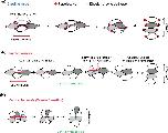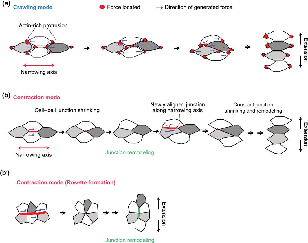 Figure 2. Two modes of convergent extension. (a) Driving force and cell movements in the crawling mode. The cells elongate along the mediolateral axis (short axis of the elongating tissue) and crawl and tug the neighboring cells by actin-rich protrusions located at both tips of the elongated cells (red parts) that lead to the intercalating movements. (b, b′) Driving force and cell movements in the contraction mode. Activation of actomyosin along the cell–cell junction constricts the junction (red line) and pulls the neighboring cells (dark and light gray colored cells) to the center in this scheme. The actomyosin is activated at the cell–cell junction aligning along the short axis of the elongating cell. After the neighboring cells meet together, these two cells construct a new cell–cell junction (junction remodeling, green short line), and actomyosin starts constricting the other cell–cell junction aligned to the short axis of the tissue. Repeating these events allows the cell to establish intercalating movements. (B′) is a scheme of rosette formation. |