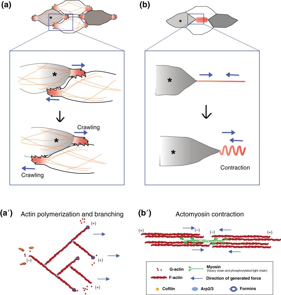 Figure 3. Driving forces of the two modes of convergent extension. (a) Actin-rich protrusions allow the cell to crawl along the neighboring cells. Actin is polymerized at the protrusions and pushes the membrane forward between the neighboring cells. The actin cables provide the resistant force for cell elongation, in order for the cells to tug the adjacent cells by the crawling motion. In this model, the cells move actively. (aâ²) A model of actin filament polymerization and branching. Actin-binding proteins such as Arp2/3, Formin, or Cofilin function to branch, polymerize or sever the actin filament. (b) Actomyosin activation constricts the cellâcell junction. The neighboring cell (gray colored) is pulled by the shrinking cellâcell junction. In this model, the cells move passively. (bâ²) A model of actomyosin contraction. Phosphorylation of myosin light chain triggers the actin filaments to slide toward the myosin complex. |