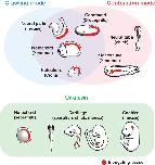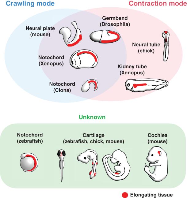 Figure 4. Various tissues showing convergent extension. Classification of CE models based on the crawling and contraction modes. Membrane protrusions are observed during CE in the mouse neural plate, Xenopus laevis notochord, and Ciona intestinalis notochord (i.e., crawling mode: blue circle). The formation of X. laevis notochord also exhibits the contraction mode, and it is thought that the mouse neural plate and C. intestinalis notochord also display the contraction mode. Cell–cell junction contractions are observed during CE in Drosophila melanogaster germband extension, chick neural tube elongation, and X. laevis kidney tubule elongation (i.e., contraction mode: red circle). Although there are other developmental processes showing CE, their modes are unclear (green box). |