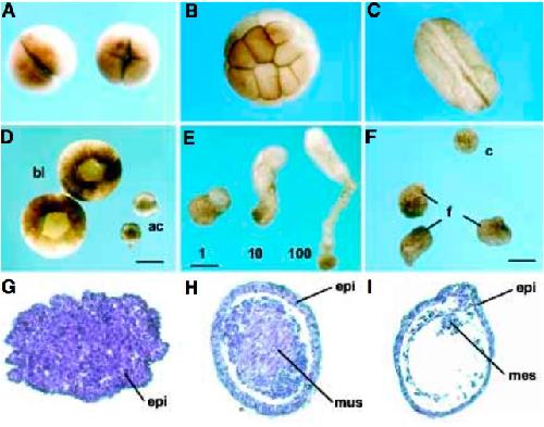 Fig. 2. Early embryos and animal cap explants obtained by students. (A) 2-cell and 4-cell embryos viewed from the animal pole. (B) 16-cell embryo. (C) Neurula-stage embryo viewed from the dorsal side. (D) Animal cap (ac) explants dissected out from blastula embryos (bl). (E) Animal caps treated with 1 ng (1), 10 ng (10) or 100 ng (100) of activin. (F) bFGF-treated (f) and control (c) animal caps. (G) Histological section of an animal cap control. (H) Histological section of an activin-treated animal cap. (I) Histological section of a bFGF-treated animal cap. epi, epidermis; mus, muscle; mes, mesothelium. Bar (D-F): 500 μm