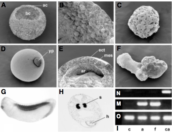 Fig. 3. Embryo morphology, muscle gene expression and animal cap induction analysis. Scanning microscopy photographs (A-F). (A) Transverse section through the blastula showing blastocoel cavity (bc) and ectodermic animal cap (ac). (B) Blastocoel roof of (A) at higher magnification. (C) Control animal cap. (D) Late gastrula showing yolk plug (yp). (E) Transverse section through the gastrula showing archenteron (ar), ectoderm (ect), mesoderm (mes) and endoderm (end) cells. (F) Activin-treated animal cap. (G) Whole-mount in situ hybridization of tadpoleembryo made with an MLC1f/3f mRNA antisense digoxygenin probe. (H) In situ hybridization, transverse section of tadpoleembryo, with an MLC1f/3f mRNA S35 antisense probe. Somites (s) are strongly labeled but not the heart (h). (I) RT-PCR analysis of animal cap explants treated with activin (a), bFGF (f) or caffeine (ca), or untreated (c). The amplified fragments correspond to N-CAM (N), MLC1f/3f (M) or ODC (O) mRNAs.