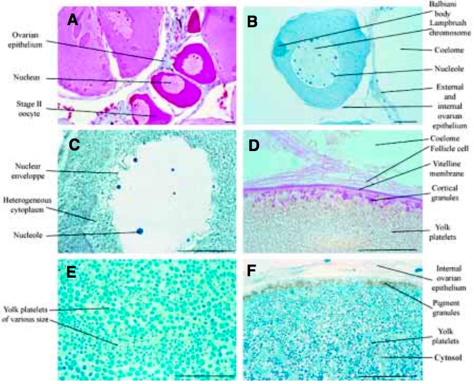 Fig. 5. Histological, cytological and histochemical observations of the principal features of Xenopus laevis oogenesis. Stained, paraffin-embedded Xenopus laevis ovary sections. (A) Trichrome staining showing oocytes at various stages. (B,C) Unna blue staining showing previtellogenic stage-II oocyte. (D) P.A.S. staining of a vitellogenic oocyte. (E,F) Unna blue staining of vitellogenic oocyte. Bars: 100 μm in A-D and F; 25 μm in E.