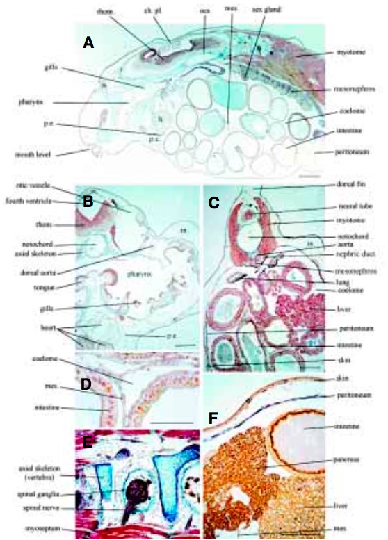 ig. 6. Histological sections of embryos illustrating body plan organization. Trichrome stainings of paraffin-embedded Xenopus laevis tailbud sections. (A) Sagittal section of the anterior third of an embryo. (B-D, F) Transverse sections. (B) is a section through the pharynx and gills and (C) is through the trunk. (D) is a detail of intestine and peritoneum. (E) Sagittal section illustrating metamerization. (F) is a detail of various viscera. ch.pl., choroid plexus; mes, mesentery; oes, esophagus; p.e., pericardial epithelium; rhom, rhombencephalon. Bars: 200 μm.
