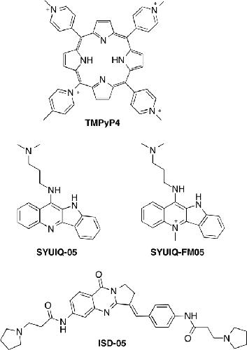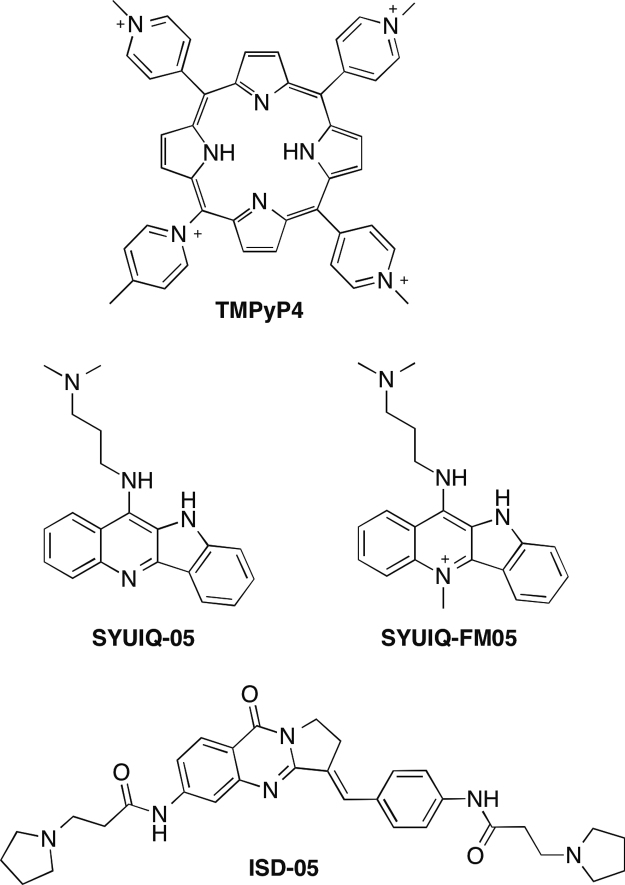 Fig. 1. Structures of the G-quadruplex ligands used in this paper, the cationic porphyrin TMPyP4, the quindoline derivatives SYUIQ-05 and SYUIQ-FM05, and the isaindigotone derivative ISD-05.