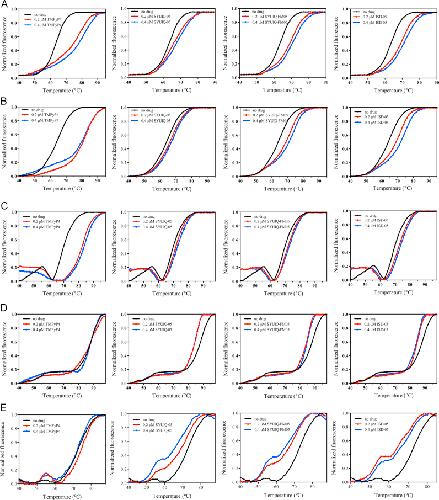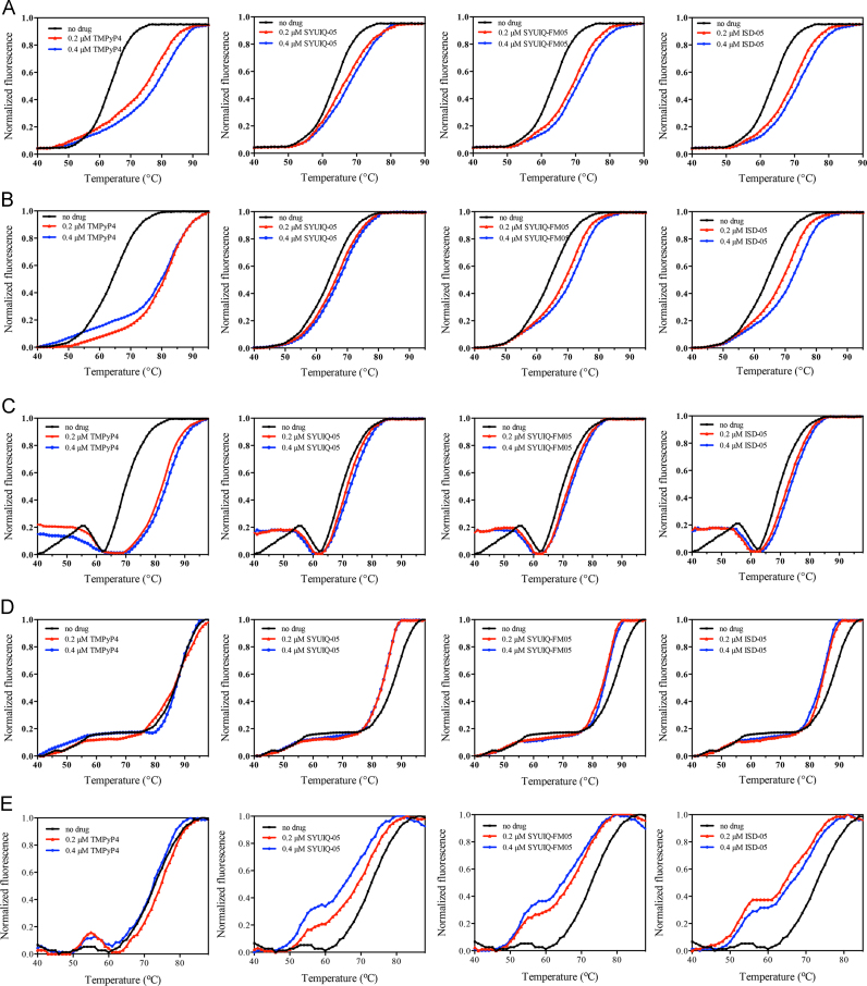 Fig. 4. The FRET melting curves of HTG-21 G-quadruplex in ionic buffer (A), dialysis buffer (B), cell-free system (C), control system (D), and Xenopus laevis egg extracts (E), with or without 0.2 μM or 0.4 μM TMPyP4, SYUIQ-05, SYUIQ-FM05, and ISD-05.