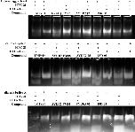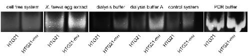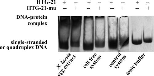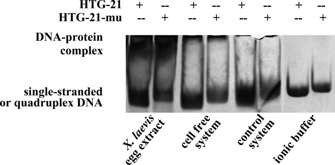 Fig. 7. Gel electrophoresis of HTG21 in ionic buffer [10 mM Tris–HCl buffer (pH 7.4) containing 110 mM KCl], cell free system, Xenopus laevis egg extract, and control system (the dialysis buffer containing 40% PEG).
